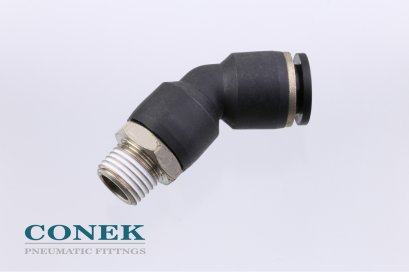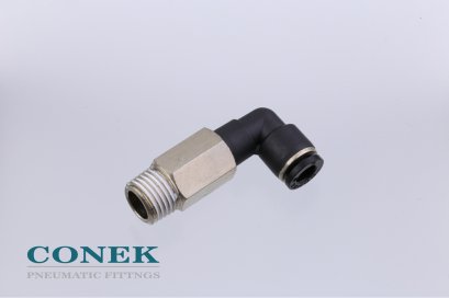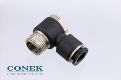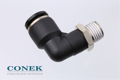 PV ข้อต่อชนด้านเท่า งอ 90องศ ฟิตติ้งลมยี้ห้อ Conek สำหรับเสียบสายลมพียูหรือสายลมไนล่อน ผลิตจากพลาสติกคุณภาพสูง ใช้งานที่แรงดัน 0-8 Bar ทำงานที่อุณหภูมิ 0-60℃ มีให้เลือกใช้กับสายลมขนาด 4mm,6mm,8mm 10mm,12mm,16mm (ก่อนสั่งซื้อโปรดระบุขนาดสายลมและขนาดเกลียวทุกครั้ง