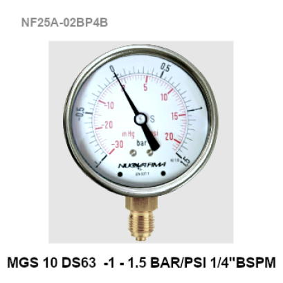 คอมปาวด์เกจย่านวัด -1-1.5 Bar (-30-20 inHg) เกลียวทองเหลือง 1/4" NPT/BSP ตัวเรือนทำจากสแตนเลส สามารถเติมน้ำมันได้ Compound Gauge