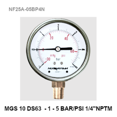 คอมปาวด์เกจย่านวัด -1-5Bar (-30-72 PSI) เกลียวทองเหลือง 1/4" NPT/BSP ตัวเรือนทำจากสแตนเลส สามารถเติมน้ำมันได้ Compound Gauge